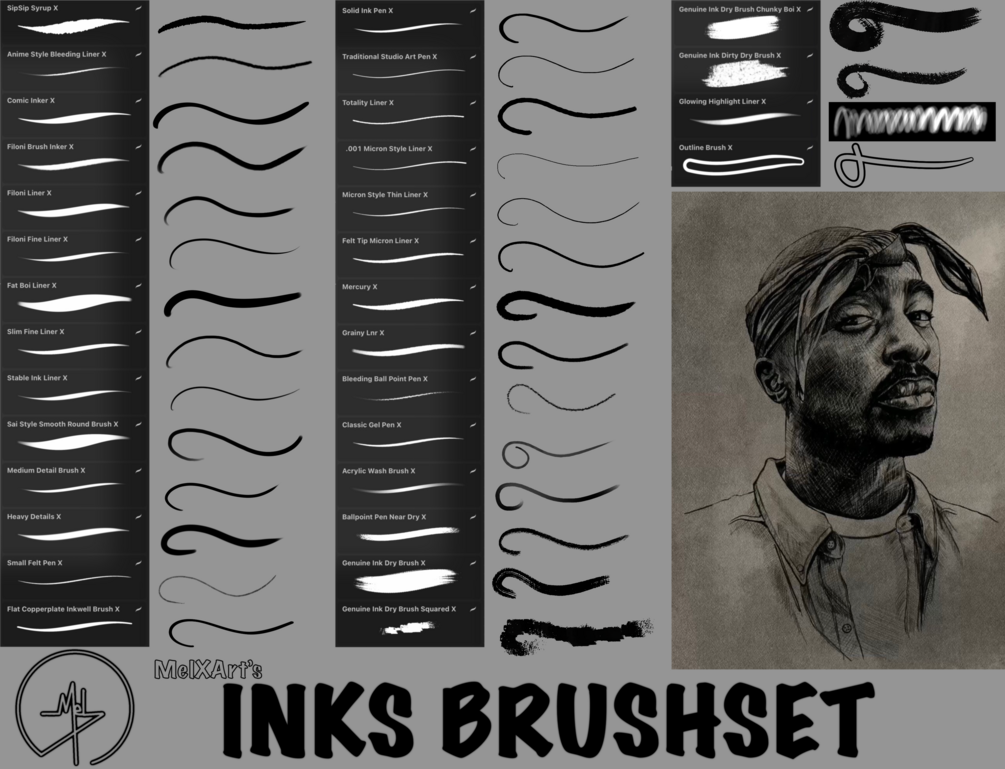 Inking is always the most zen moment for me when creating anything that resembles comic book style art or a piece that is mostly crosshatching, so through the 11 years of using Procreate I created a large array of different types of Inking Brushes, they came to a total of 34 brushes, some are set to feel like Micron Pens, some feel like pentel ink brushes, some feel like Inkwell dip pens, gel pens, felt pens and good ol' ball point pens, they vary from dry brushes to solid flowing brushes. all in all I feel like this might be the most complete collection of Ink Brushes out there and i'm not joking.