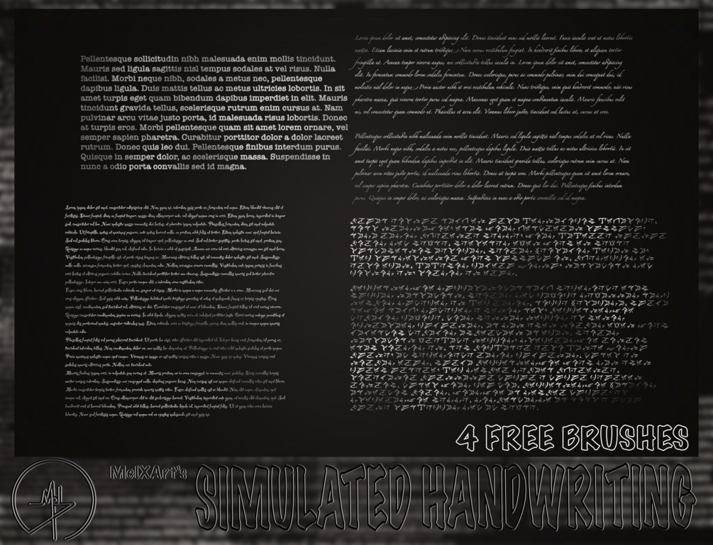 Hey! this is a bonus FREE brushset that was inspired by someone on Reddit asking if there was a "Lorem Ipsum" brush, its basically the gibberish that is used as writing in books and text in different media, so i made 4 free brushes that simulate different types of fonts.